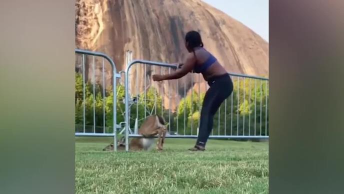KOMIČNO! Srna se zaglavila u metalnoj ogradi, devojka je trčala i naišla na nju, nije uspevala da joj pomogne, ali onda se desilo nešto urnebesno (VIDEO)