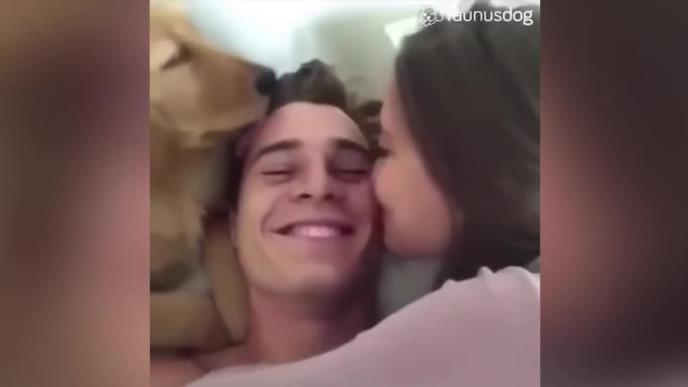 On leži, devojka ga ljubi, a pas ga liže po licu.