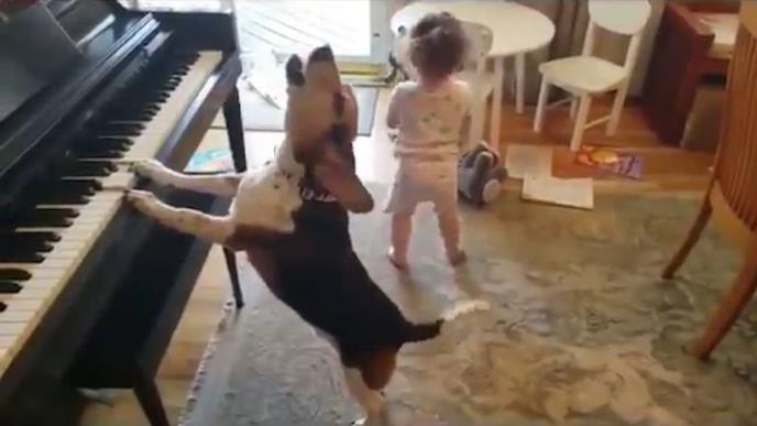 Ali ovakav snimak gde su kuca i malena devojčica zajedno sami u dnevnoj sobi, da se zajedno igraju, a istovremeno svako se zabavlja na svoj način, definitivno nismo videli.