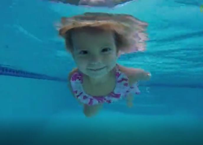 Ona ima samo dve godine, a pliva kao prava mala sirena. Uspeva čak i da prepliva ceo bazen, okreće se u vodi, roni, izlazi na površinu da uhvati vazduh, a sve to sa lakoćom i neodoljivim osmehom na licu.