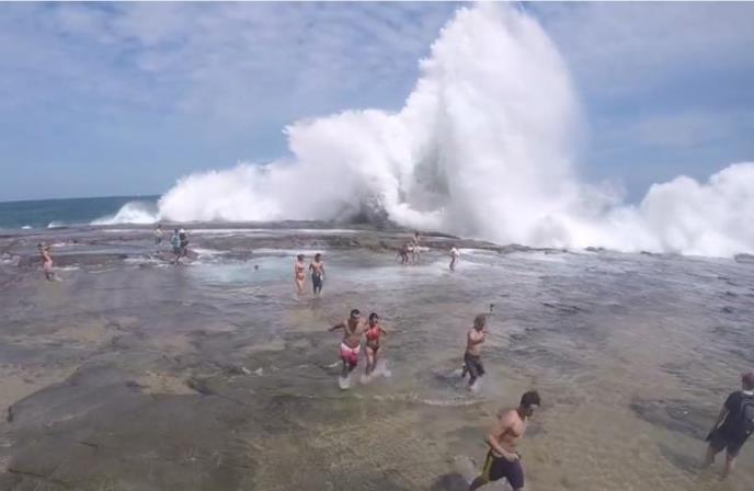 Na snimku vidimo grupu turista koji stoje na jednoj od stenovitih ploča u trenutku kada nailazi talas. Čovek koji snima počinje da paniči jer shvata šta se sprema. Talas je naišao brzo i razbacao ljude na sve strane. Sreća, ovaj put niko nije ozbiljnije povređen.
