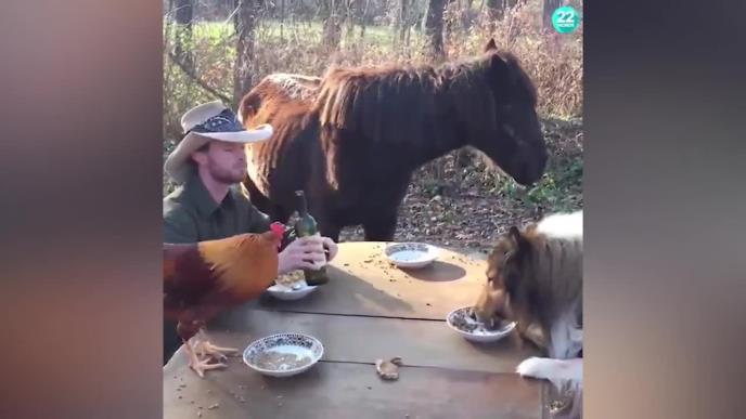NEVEROVATAN RUČAK ZA ČETVORO! Za istim stolom sede i jedu čovek, petao, pas i konj, ali samo on ima kašiku i pije iz flaše! (VIDEO)