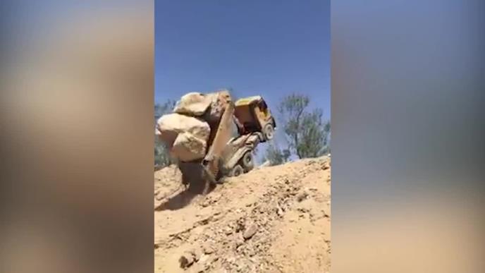 Nimalo nije prijatna slika posmatrati prevrtanje ovog kamiona punog ogromnih stena.