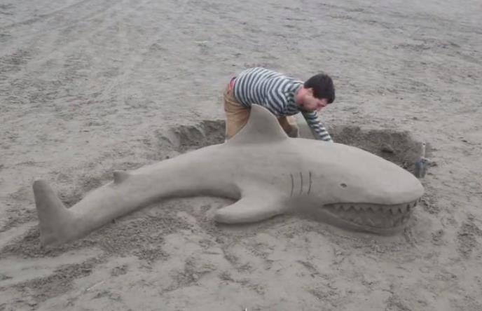 Na snimku vidimo nastanak jedne skulpture u obliku ajkule, koja izgleda veoma verodostojno. Kada gledamo ovog umetnika, čini se lako, pa eto ideje da sledeći put pokušamo da se zabavimo na plaži i vratimo se u detinjstvo.