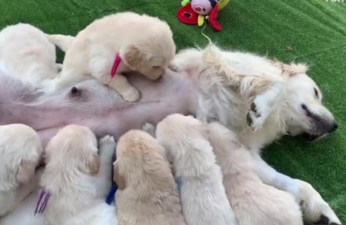 Ova ženka zlatnog retrivera po imenu Maja, verovatno je iscrpljena brinući o svojih osam beba, i taman kada je htela da odrema, štenci su imali drugi plan. Svih osam gladnih kuca počelo je da sisa u isto vreme. Mama Maja je shvatila da od odmora nema ništa, bar dok deca malo ne porastu.