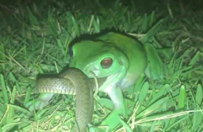 Video nam pokazuje koliko je surova borba za opstanak u prirodi. Žaba, američka čumska gatalinka, vrlo uspešno je savladala zmiju i malo po malo je guta.