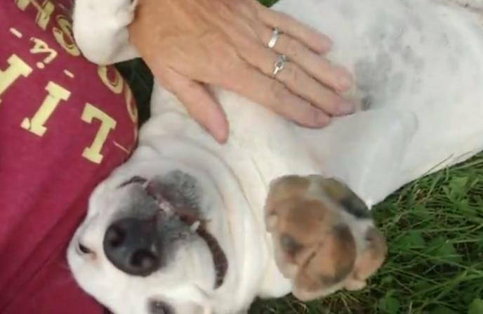 Ova porodica voli da provodi vikende u prirodi, igrajući se na travi. Baš u takvom trenutku nastao je ovaj snimak. Sara leži na leđima uz svoju vlasnicu koja je češka po stomaku, dok je na licu psa ogroman osmeh uživanja.
