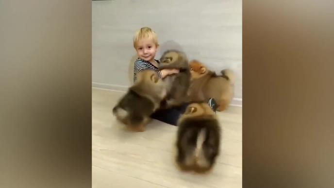 NE ZNA SE KO JE SLAĐI! Maleni plavi dečak se igra sa četiri kučenceta! (VIDEO)