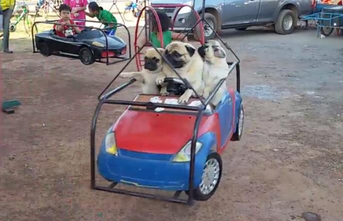 Ovaj simpatični video nastao je na jednom vašaru na Tajlandu. Tri mopsa voze se na ringišpilu kao prava deca. Ne bune se, sede mirni kao bubice, i samo izrazom lica ispoljavaju svoje oduševljenje i čuđenje.