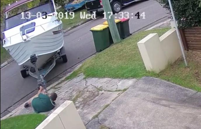 Istog trenutka, prikolica sa brodom krenula je nizbrdo, čovek je pokušao da je zaustavi, pao je nemoćan na asfalt, a prikolica je nastavila da ga vuče po betonu.