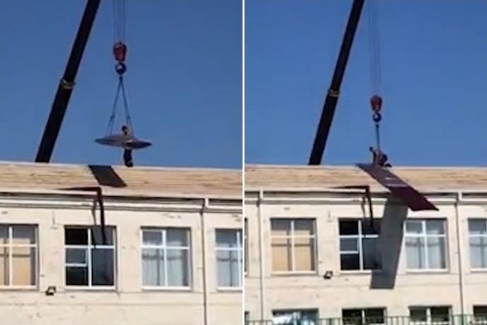 Pošto je stari krov na školi u ruskom mestu Staroščerbinovskaja dotrajao, majstori su došli da postave novi lim na zgradu. Jedan od radnika se popeo na vrh krova i čekao da dizalica spusti limene ploče, dok su školarci sve to pratili sa suprotne strane dvorišta i snimali mobilnim telefonom.