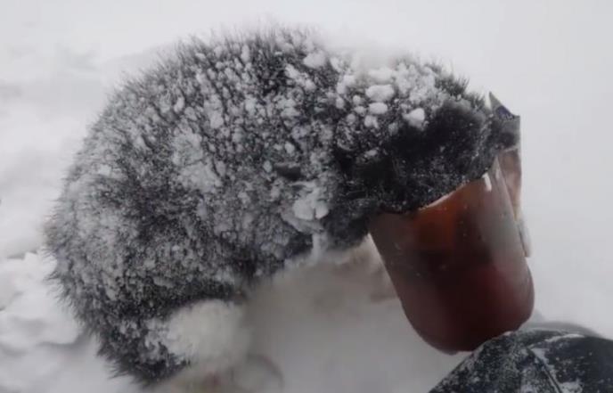 Sam početak ovog snimka veoma je tužan. Vidimo štene promrzlo u dubokom snegu Rusije, sa glavom zaglavljenom u presečenoj plastičnoj flaši. Kuca je već bila zanemoćala, slabih pokreta. Srećom, baš tuda je prolazio čovek sa svojim psom, ugledao je malog haskija, prišao mu i, malo po malo, uspeo da odglavi njegovu glavu iz flaše.