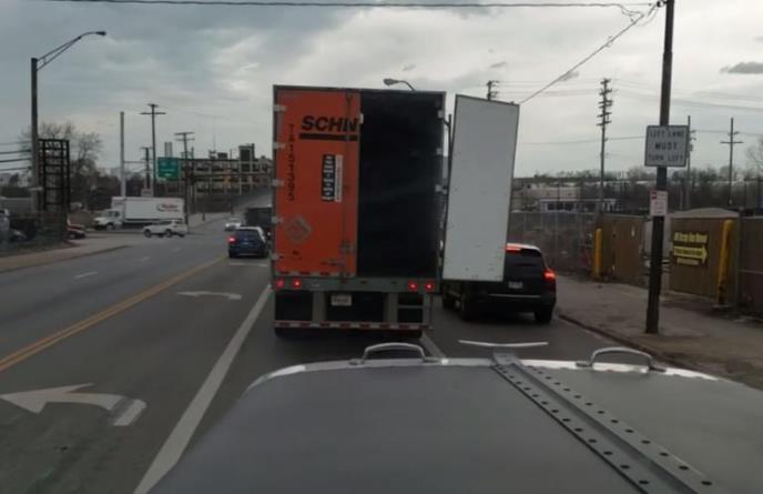 Ovaj nesvakidašnji video nastao je na ulicama američkog grada Klivlenda. Vozač je ispred sebe ugledao kamion sa otvorenim vratima prikolice, uzeo telefon, upalio kameru i zabeležio poprilično komičan momenat.