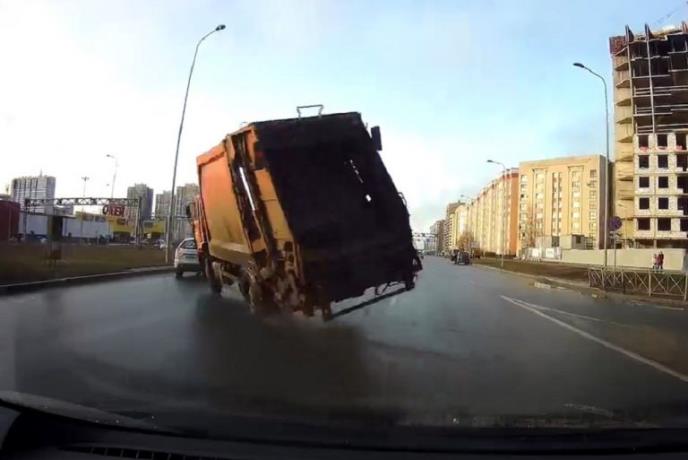 Obično smo navikli da se đubretarski kamioni kreću sporo, sa čestim zaustavljanjima da bi radnici ispraznili kontejnere i kante. Snimak iz Sankt Peterburga, međutim, pokazuje šta se dešava kada takvo vozilo izleti velikom brzinom sa sporednog na glavni put.