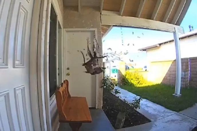 Kamera koju je jedna američka porodica iz postavila na trem svog doma u gradu Mišon Vijeho slučajno je zabeležila prirodi. - Ovo je snimljeno na prednjem tremu naše kuće. Jastreb je jurio grlicu, koja je u bekstvu naletela na prozor. On je odmah nasrnuo na nju i uhvatio je u letu, dok je perje letelo na sve strane, napisano je u komentaru snimka. Nakon što je ščepao žrtvu jastreb ju je još nekoliko sekundi držao zarobljenu, a onda odleteo sa njom u kandžama.