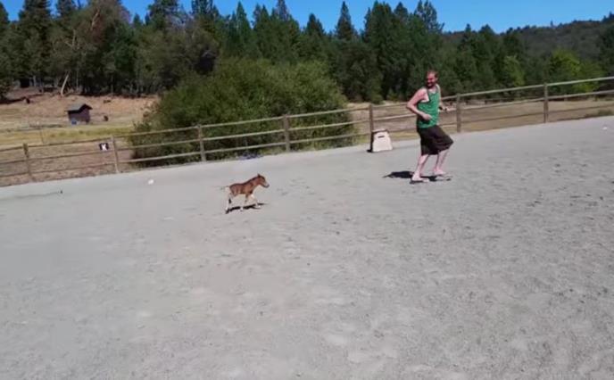 Sve je izgledalo lepo, dok čovek nije pokušao da pobegne svom ljubimcu i dao se u trk. Beba konj kada je videla kako joj gazda odmiče dala se u galop i za tili čas ponovo je bila uz svoga gazdu.
