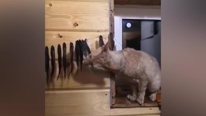 Mačke su veliki sladokusci kada je riba u pitanju. Bila sveža ili pečena, ne biraju, samo nek je riblje meso na meniju. Ova preslatka mačka je otkrila gde se suše sardele. Pošto je čulo mirisa odvelo tamo, kada ih je jednom probala nije mogla da prestane da ih jede.