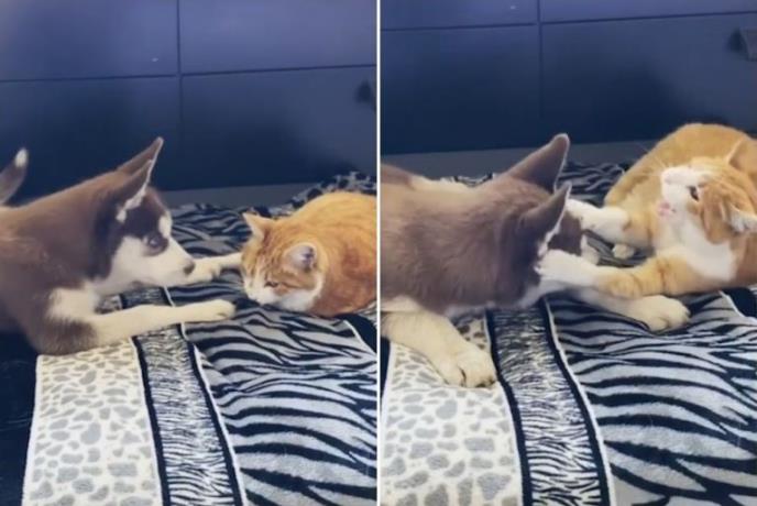 DIŽI SE! UVELIKO JE DAN! Maleni haski bi da se igra, a mački se ne mili da ustaje! (VIDEO)