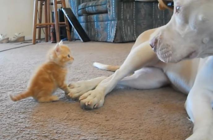 Klipovi sa psima i mačkama stalno su urnebesni, a naročito ovakvi kada su glavni junaci malo mače i veliki opasni pit bul.