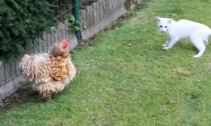 Kokoška je svo perije nakostrešila i spremila se za borbu, ali mačka to nije očekivala i radila je zaista urnebesne stvari.