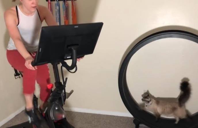 Uz svoju gazdaricu i ova umiljata mačka odlučila je da počne da trenira. Svaka od njih u skladu sa svojim potrebama ima spravu za vežbanje, gazdarica bicikl a mačka krug unutar kog trči! Da trening nije naivan poduhvat i da samo najuporniji i najizdržljiviji opstaju, dokaz je i ovaj snimak na kome se vidi kako je ovoj mački nakon svega nekoliko minuta vežbanja pozlilo do te mere da je povratila po spravi za vezbanje. Ova kućna ljubimica će posle ovog događaja sigurno odustati od svojih namera da vodi zdrav život i da pazi na liniju!