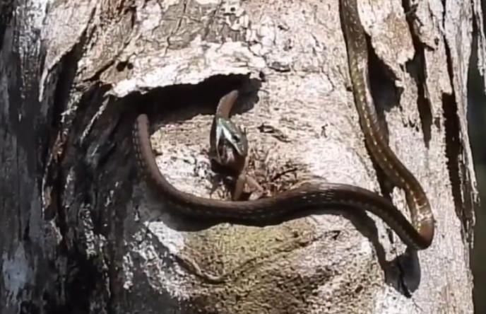 Zmija je tražila doručak u rupama drveta, pa je posmatrač upalio kameru i počeo da snima, jer mu se scena učinila zanimljivom. Nakon što je zmija tražila neko vreme, konačno je u rupi drveta našla svoj plen, izvukla žabu i progutala je.