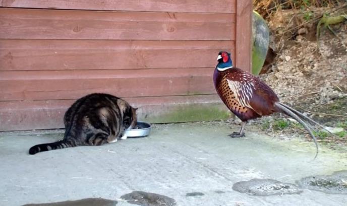 Mačka je najnormalnije iz svoje činije jela svoj obrok, a on je toliko mirisao da je privukao ovog fazana.