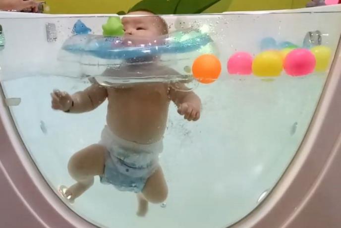 Ova beba iz Malezije od malih nogu već uživa "kao paša". U spa bezenčiću namenjenom najmlađima, sa gumom koja joj drži iznad površine, ona nema nikakav strah od vode, već mirno pluta među svojim omiljenim igračkicama.