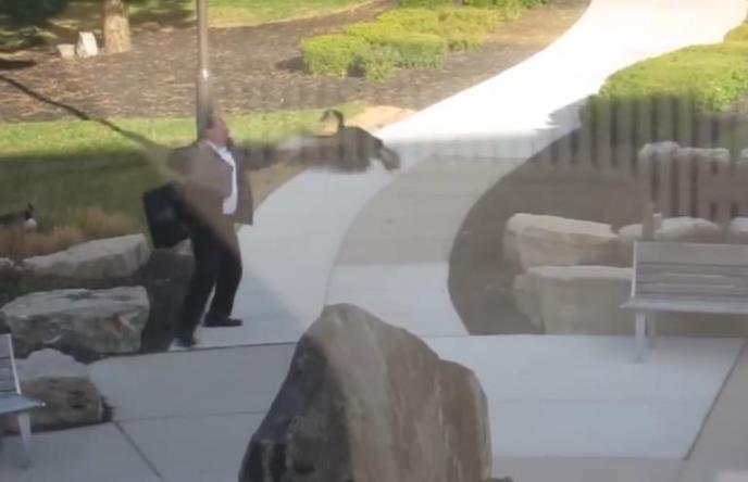 Ovo je najupornija i najluđa guska koju ste ikada videli. Dok je čovek sasvim normalno i nenapadno išao sa posla i prolazio pored guske, ona mu je prišla i počela da ga napada. Letela je ka njemu, nekoliko puta kretala u novi napad, ali je na kraju čovek ipak uspeo da prođe i nastavi svoj put. U pozadini snimka čuje se grohot ljudi koji gledaju ovaj video sa nadzorne kamere. Agresivna ptica je takozvana kanadska guska, vrsta divlje guske poreklom iz Severne Amerike. Prvi put su donete u Evropu u 17.veku, na britansko ostrvo gde se danas razmnožava 82 000 ovih ptica. Crna glava i vrat sa belom trakom ispod brade odlikuju kanadsku gusku, izdvajajući je po izgledu od ostalih iz svog roda. Ove ptice su dugačke do 110 centimetara i imaju raspon krila do 180 cm. Mužjaci tipično teže između 3.2 i 6.5 kg i veoma su agresivni kada brane teritoriju. Ženke su izgledom identične iako su za 10% manje od mužjaka i teže od 2.5 do 5.5 kilograma i oglašavaju se drugačijim zvukom. Životni vek kanadskih gusaka u divljini iznosi između 10 i 24 godine.