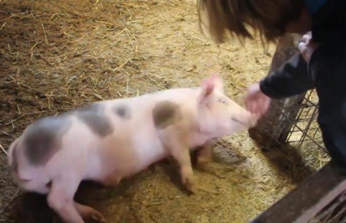 Tako je, potpuno neočekivano, ovo prase jedno od najnežnijih stvorenja koje ćete videti. Ono je prišlo ženi koja je ispružila ruku ka njemu, i dopustilo da ga češka.