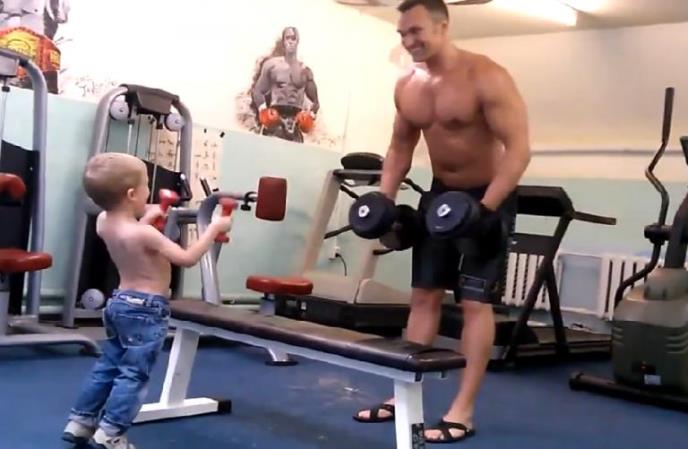 Dete je svakako malo za teretanu, ali ne i za kvalitetno provedeno vreme sa svojim tatom, što je najbitnije. Ovde se vidi kako se deca ugledaju na svoje roditelje i koliko je bitno dati im pravi primer.