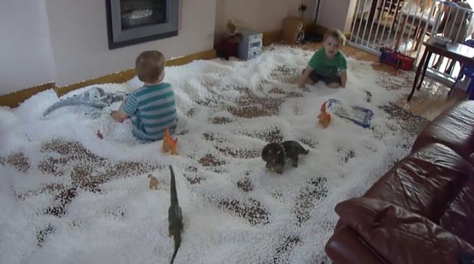 Zatekla ih je kako se valjaju po kuglicama od stiropora koje su prethodno izvukli iz lazybag-a! Ako vaša deca kukaju zašto ove zime nema snega, nemojte im pokazivati ovaj video!