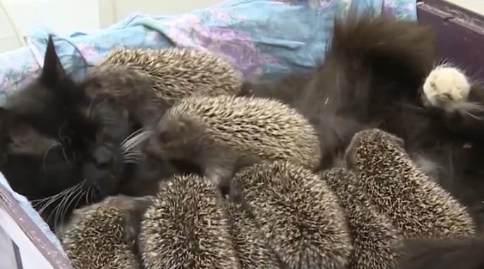 Ovaj video snimak predstavlja svojevrsno čudo. Prikazuje nam crnu persijsku mačku koja je usvojila osam malih ježeva. Dok oni sisaju, ona brine o njima kao da im je prava majka.