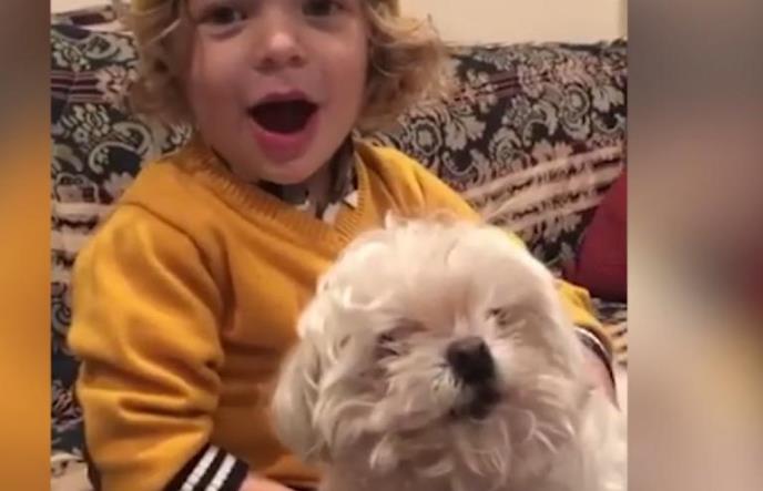 Preslatki dečak kovrdžave plave kose drži svog bišona i počinje pesmu, a kuca mu se vrlo brzo pridružuje svojim zavijanjem.