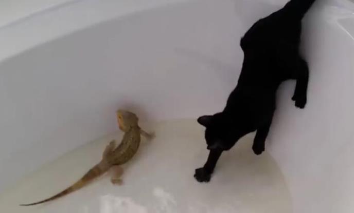 Dok je njihov gušter uživao u kadi, maca po imenu Alistar bila je radoznala, pa je malo pokušala da pokvasi šapicu, međutim, upala je unutra i automatski počela da paniči, iako je bilo vode tek na dnu kade. U tom njenom ludilu, najgore je prošao gušter koga je udarila i bacila na drugi kraj kade, a mačka je do kraja snimka grebala i pokušala da se spasi.