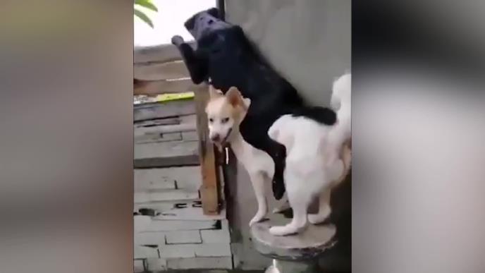 Ova tri psa su presmešna. Špijuniraju nekog preko ograde, ali najsmešnije je kako jedan drugom pomažu da se podignu iznad letvi i da vire. Jedan je glavni špijun, drugi mu pomaže, a treći sve mirno posmatra. Ovo je potpuni urnebes koliko su smešni.