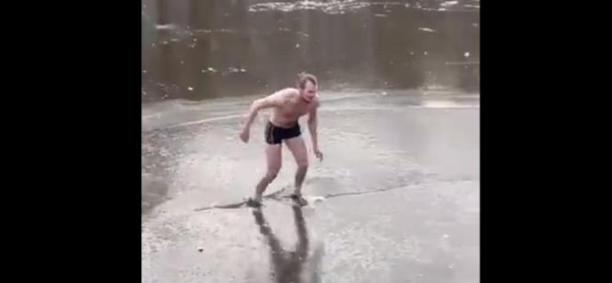 Video je postao hit na društvenim mrežama, a počinje tako što momak, samo u boksericama kliza po jednom kanalu. U nekom trenutku led puca, a on upada u ledenu vodu.