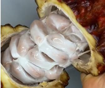 - Ovo je predivna kakao mahuna, a mi ćemo napraviti prženi kakao u zrnu. Unutra su semenke koje imaju slatko-belu opnu -