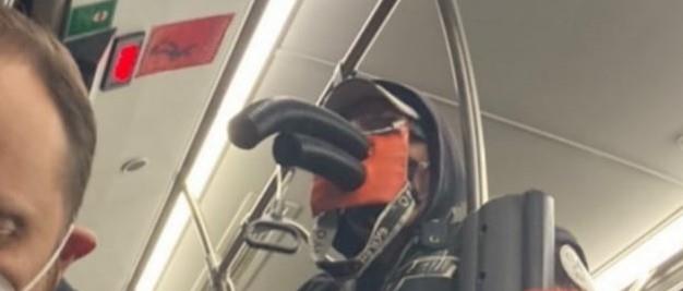 Na liniji 72 u beogradskom autobusu pojavio čovek sa neobičnom maskom koju je očigledno napravio sam. Maska ima dve plastične cevi i platno kroz koje prolazi plastika.