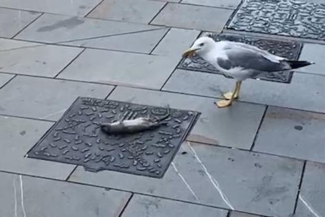 Pacov je mrtav, nije poznato da li mu je galeb došao glave, ali u svakom slučaju ptica uživa u ručku grickajući komad po komad. Sve je to snimio reporter Kurira u čuvenom italijanskom gradu.