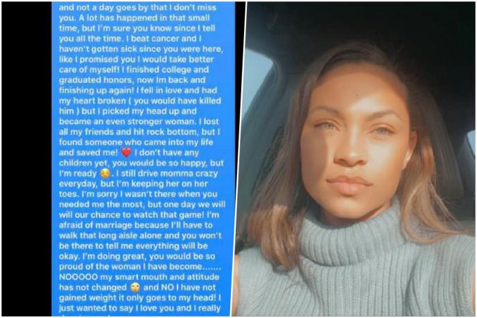 Njena duga poruka, postavljena na njenu Fejsbuk stranicu i podeljena više od 288.000 puta, uključivala je detalje o tome kako je pobedila rak i kako joj se stanje nije pogoršalo od njegove smrti. Takođe je pisala o tome da se zaljubila i da joj je srce slomljeno, pa se našalila i rekla - " Znam da i ga ti "ubio“.