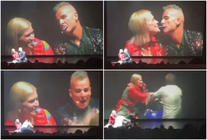 Muž je u tom trenutku dojurio i zamahnuo levom rukom prema licu mađioničara, a zatim ga je i odgurnuo ispred šokirane publike i posramljene žene.