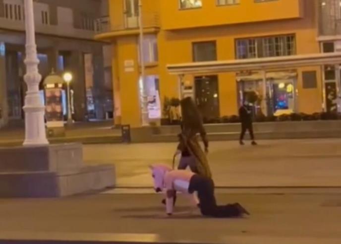 "Uočio sam neku čudnu pasminu juče na trgu, ima neko ideju o čemu se radi?", napisao je u objavio korisnik Redita, uz priloženi video, na kom se vidi kako domina šeta muškarca sa maskom konjske glave.