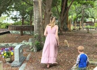 Na snimku vidimo Hejli kako šeta sa proodicom po groblju Old Smithville u Severnoj Karolini komentrašitću spomenike.