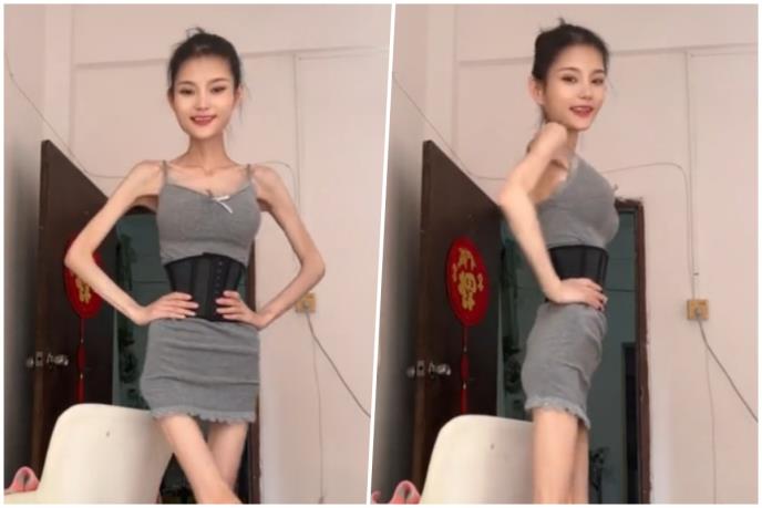 Na videu koji kruži TikTokom, mlada Kineskinja pleše ispred kamere u kratkoj, sivoj haljini sa korsetom koja pokazuje njen neverovatno tanani struk i duge premršave noge i ruke.