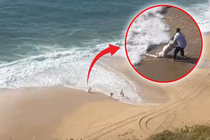 Mladoženja je pokušao da je podigne, ali pre nego što je uspeo stigao je novi talas koji, sigurni smo, nije obradovao par. Na kraju su uspeli da se izbore, ali slikanje je propalo.