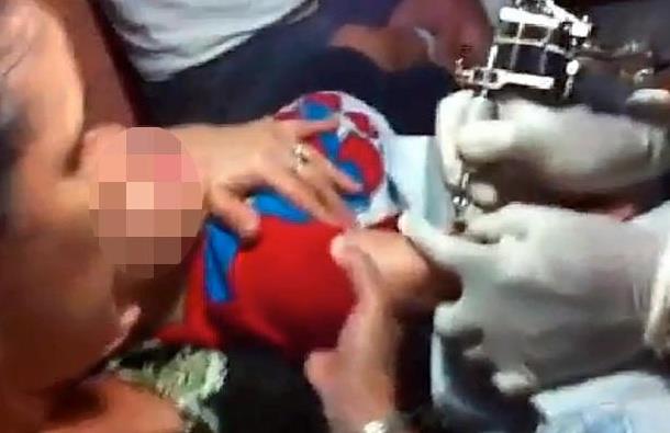 Žena koja ga čvrsto i nemilosrdno drži, najverovatnije majka, ne da mu ni da mrdne dok "umetnik" šara mašinicom sa iglom po nežnoj koži ovog nedužnog deteta.