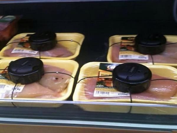 Naime, na pakovanje pilećeg mesa u komadima stavljena je naprava koja izgleda kao crna bomba i sprečava kradljivce da ukradu piletinu.