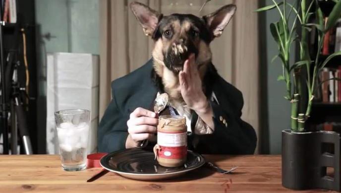 Naime, on je obukao svog psa, a neko mu je "pozajmio" ruke, pa tako izgleda kao da pas ima ruke i jede kašikom kikiriki buter. Na sebi ima košulju, sako, kravatu, pa čak i ruke. Zanimljivo je, pas se dobro najeo, dok se vlasnik ludo zabavio.