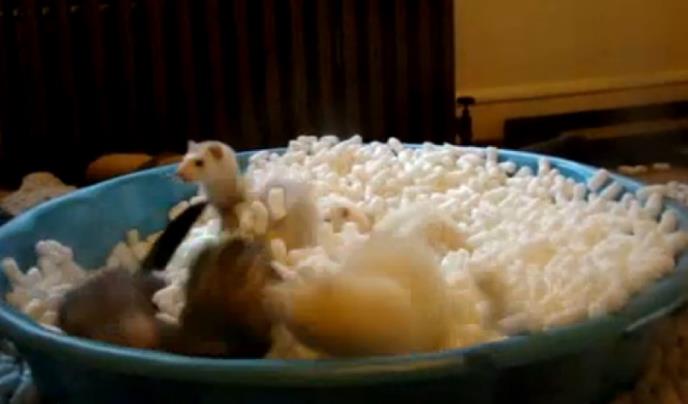 Pet malecnih tvorova uživa igrajući se u lavoru punom stiropora